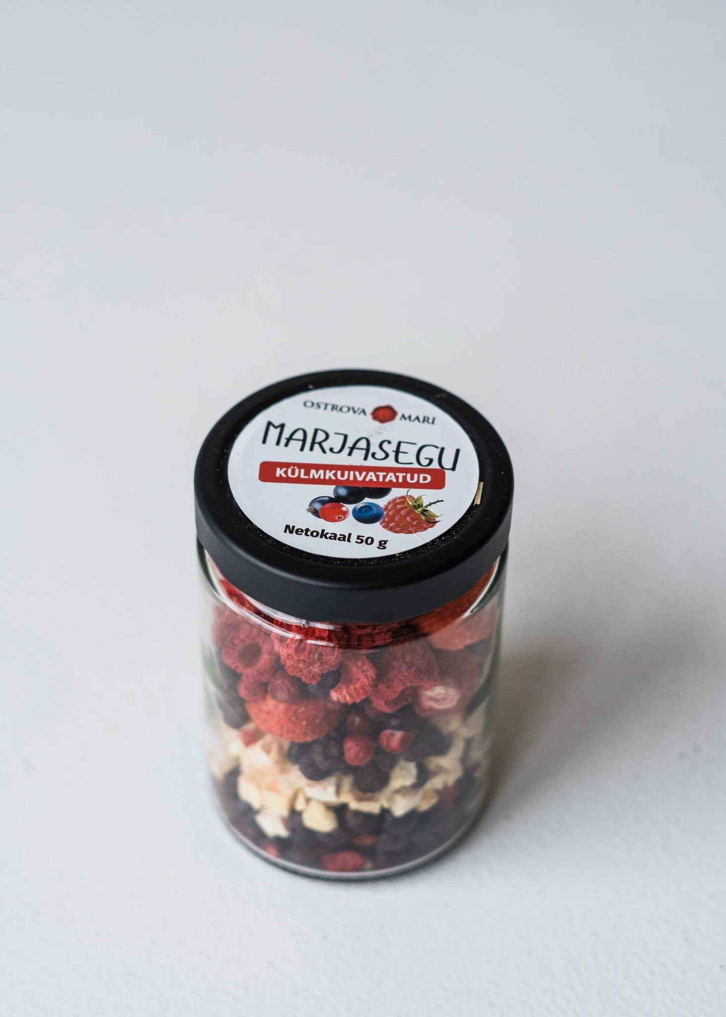 - marjasegu (maasikas, must sõstar, õun, pohl, mustikas), külmkuivatatud, 50g