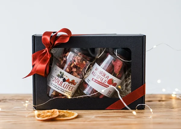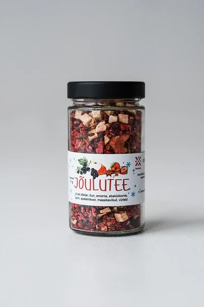 - Jõulutee (marja- puuviljatee, jõuluhõnguline) 50g. Tee sisaldab musta sõstart, arooniat, ebaküdooniat, apelsinikoort, õuna, maasikat, pohla, vähesel määral jõuluhõngulisi vürtse (kardemon, kaneel, nelk, vürtspipar, tähtaniis).